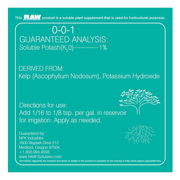 RAW Kelp is 99% Kelp extract from seaweed (Ascophyllum Nodosum). This product is water Soluble and contains only 1% soluble potash which is a direct reflection of its purity. Kelp extracts are also very rich in natural plant growth hormones. RAW Kelp is a beneficial supplement to all feeding schedules. It is also ideal for adding to foliar sprays and for creating optimal recipe solutions. Works in conjunction with all nutrient and feeding programs.