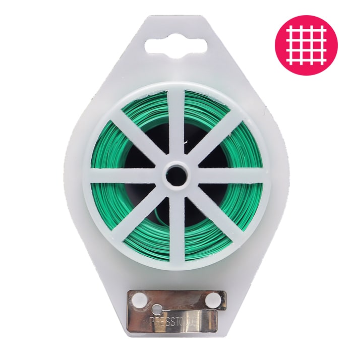 328 ft (100 meters) of strong and durable Grow1 Garden Twist Tie, perfect for securing plants to trellis, stakes, or other supports. Plastic coated for gardening and outdoor use. This package also includes a built-in cutting tool for added convenience.
