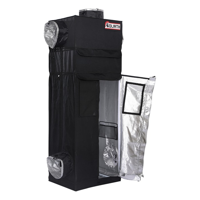 Professionally designed Goliath Grow Tents are ideal for experts and beginners alike. Expert configuration puts ducting ports in their ideal locations. Large Easy-View windows offer progress view access without compromising your growing environment. Doorways offer 360 degree access. Large configuration provides obstruction free maneuvering. Maintaining an ideal growing space is a breeze with its thick material and large double cinching duct ports.