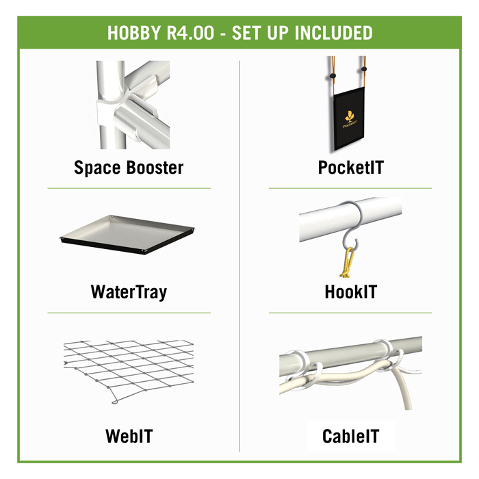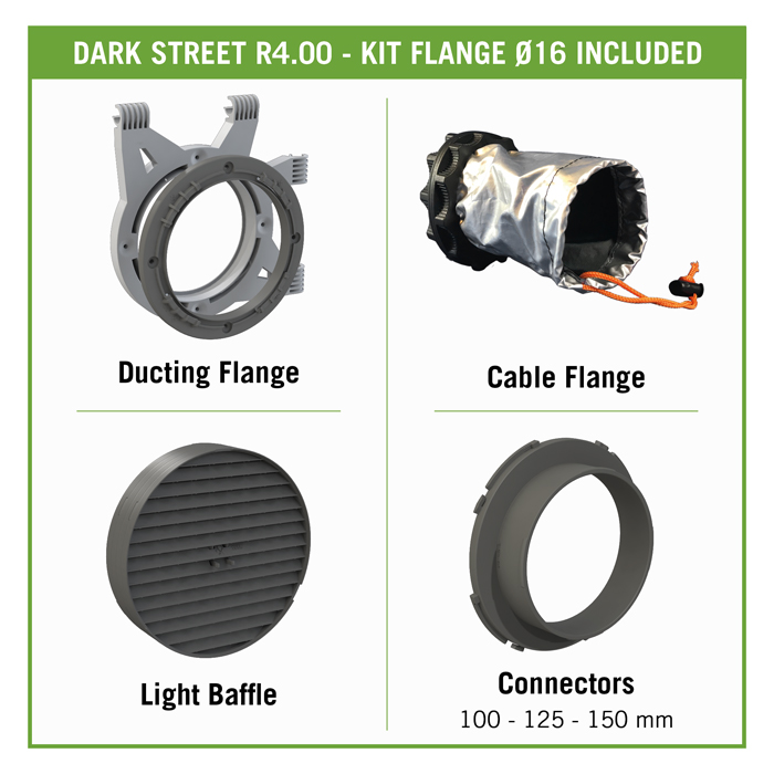 Include Ducting and Cable Flanges. Many accessories included.High quality tent made of a very reflective Mylar M210D.