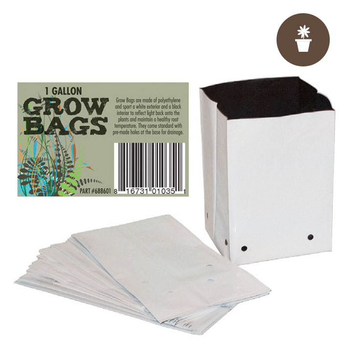 A great alternative to expensive pots, these plant-safe 5.5mil polyethylene bags have a white exterior to reflect light and a black interior to prevent algae growth and have pre-made holes in the bottom for drainage. 1 gallon sold in packs of 100, 2-3 gallon sold in packs of 50, 5-10 gallon in packs of 25.