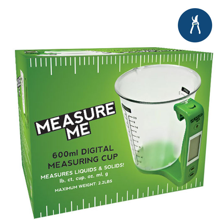 Quickly and easily measure both solids and liquids with just one tool! The MEASURE ME 600ml Digital Measuring Cup uses a scale built into the bottom of the handle to quickly and accurately measure weight and volume. Choose from Pounds, Carats, Cups, Ounces, Milliliters or Grams.