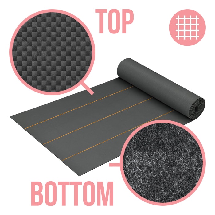 Our weed barrier mats feature 6oz (170grams) fabric, heavier than most others on the market. Double layer fabric material is 100g (3.5oz) and the non-woven layer is 70g (2.5oz).